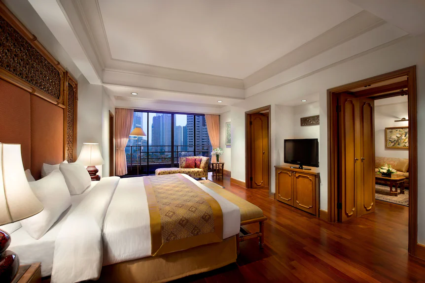 Dengan klaim 5 bintang, The Sultan menawarkan 600+ kamar yang elegan, mulai dari tipe Superior (luas 32 m²) hingga Suite kerajaan dengan pemandangan taman. Setiap kamar dilengkapi AC, TV satelit layar datar, minibar, brankas, dan kamar mandi dengan shower air panas. Beberapa unit punya balkon menghadap taman hijau yang luas—seperti oasis di tengah beton Jakarta.