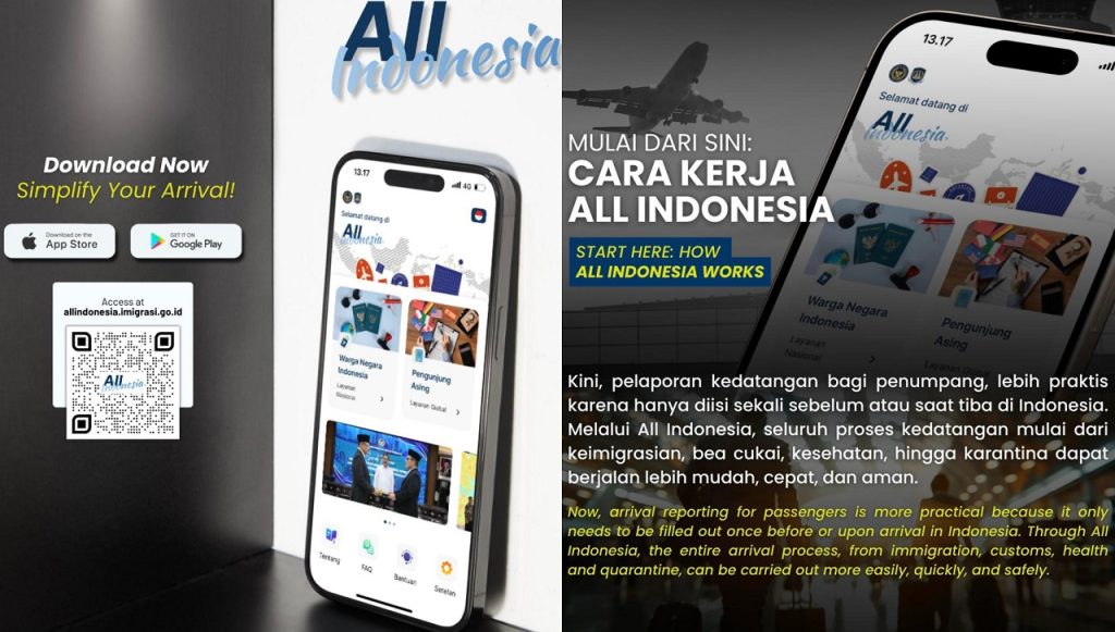 perjalanan.id – Kemudahan dalam bepergian kini semakin meningkat berkat hadirnya aplikasi All Indonesia, sebuah inovasi digital terbaru yang wajib digunakan oleh semua wisatawan yang masuk ke Indonesia mulai September 2025. Aplikasi ini menjadi solusi modern untuk menggantikan berbagai formulir manual kedatangan, seperti deklarasi kepabeanan, imigrasi, dan kesehatan, yang kini dapat diakses secara praktis dalam satu platform.