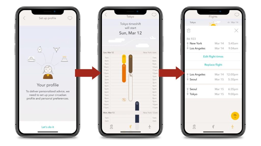 Dengan memasukkan data penerbangan, aplikasi ini akan membuat rencana anti-jet lag yang sangat personal, termasuk jadwal tidur, waktu paparan cahaya, dan rekomendasi melatonin (jika diperlukan).